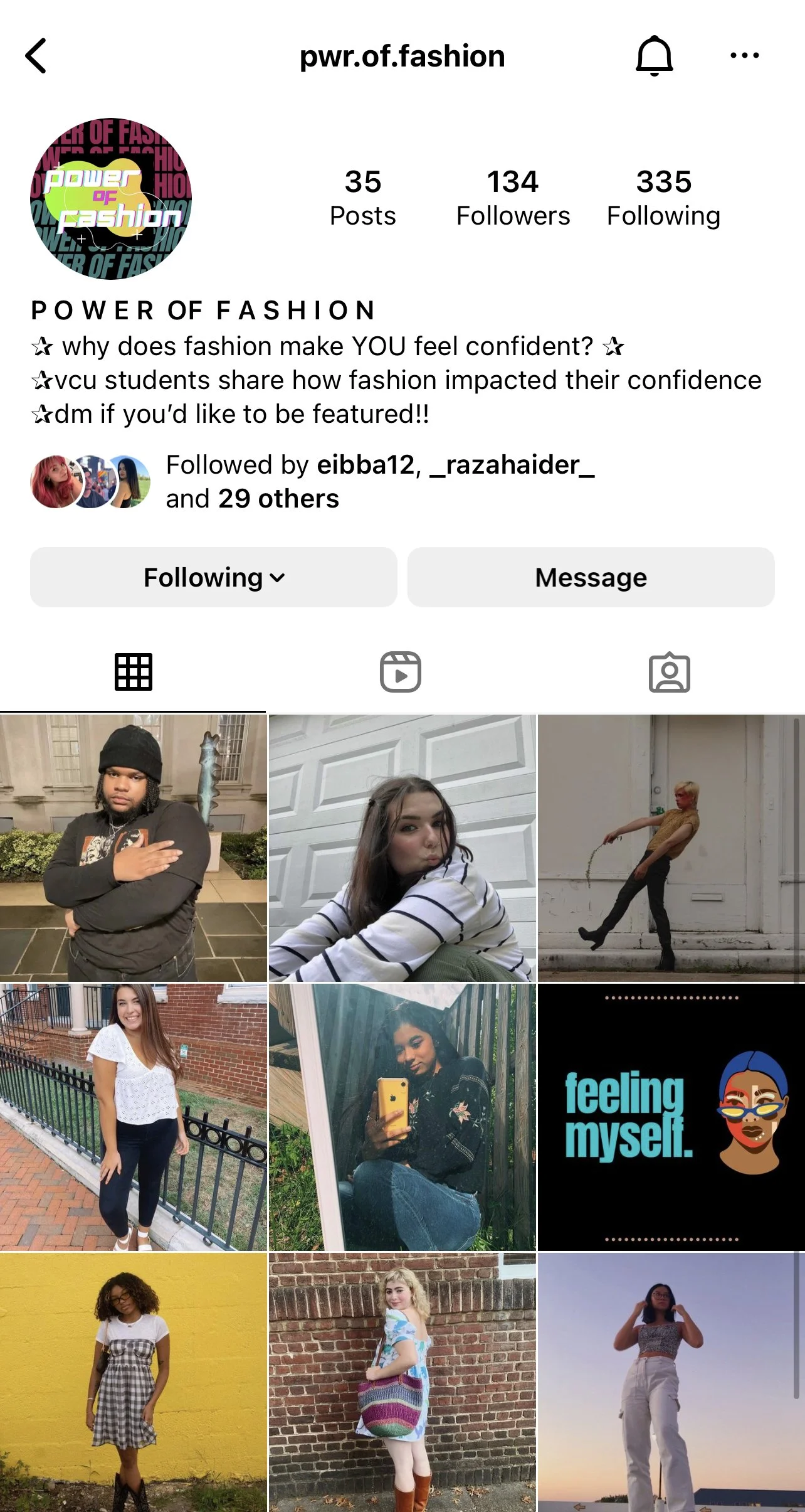 In order to execute this, I reached out to VCU students and asked them “why does fashion make you feel confident?” and a picture of them in an outfit they love. With this information, I made an Instagram page called the “Power of Fashion” and posted the students’ pictures and shared their responses to the question in the caption. In this case, the group benefiting from the practice of positive emotions and engagement are VCU students. I thought this was an appropriate choice because one of the most popular ways for college students to express themselves is through what they wear, and fashion plays a significant role at VCU because of our arts school. In addition, it is at this age that it is easy to be confused about your identity and compare yourself to everyone around you, so identifying and reflecting on something that makes you feel confident and good about yourself is crucial.