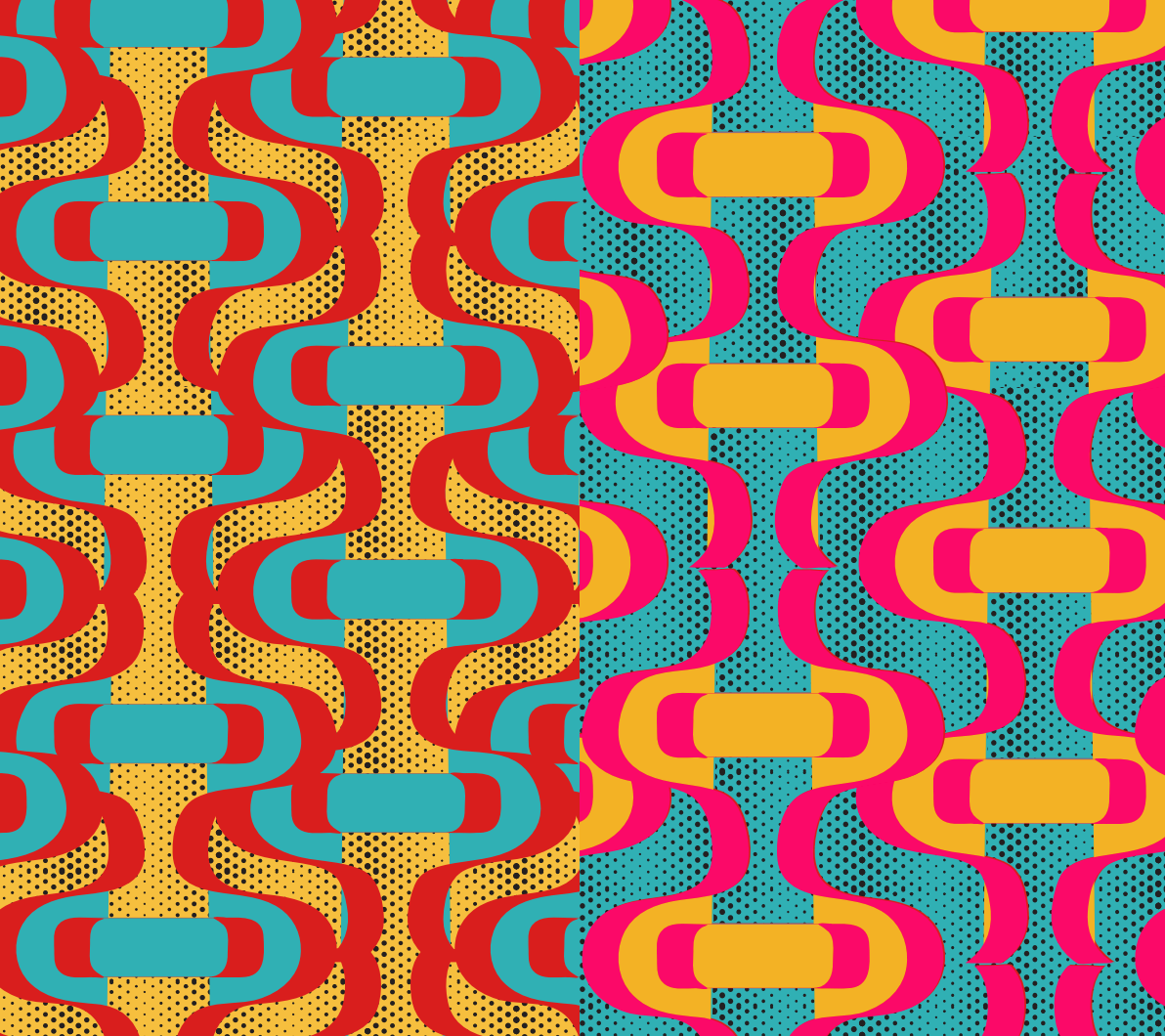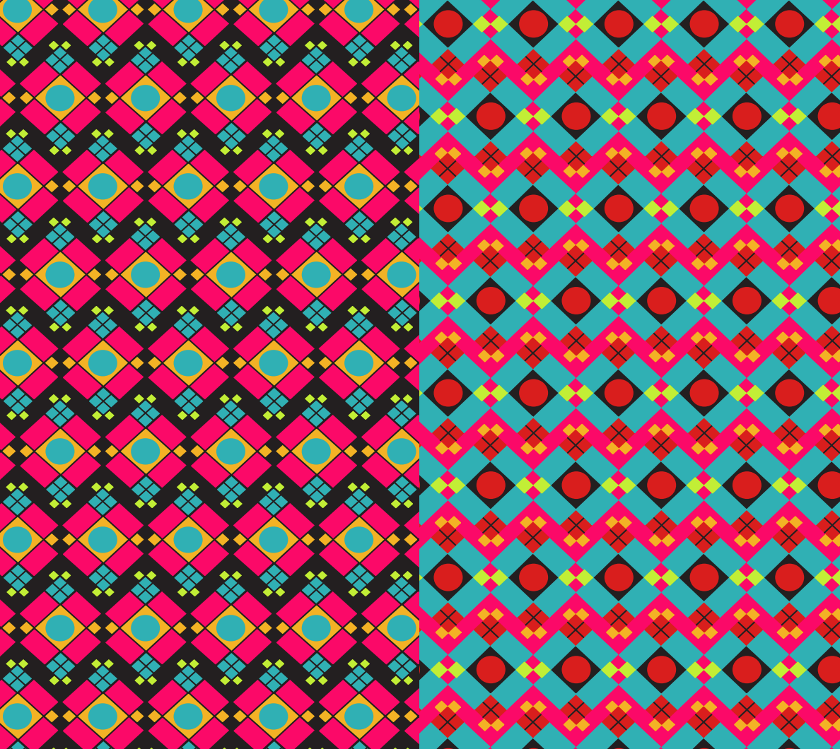 After reflecting on the mood board, I had to pick out repeating shapes in order to create icons. Along with the icons, I also had to pick out colors from the mood board, and with these selected icons and colors, the next step was to build the textiles. Putting together the icons and color palette was all done in Adobe Illustrator. I used the pen tool to trace out the different shapes on the mood board for the icons, and I used the color picker tool to get an exact match to the colors in the inspiration pictures.