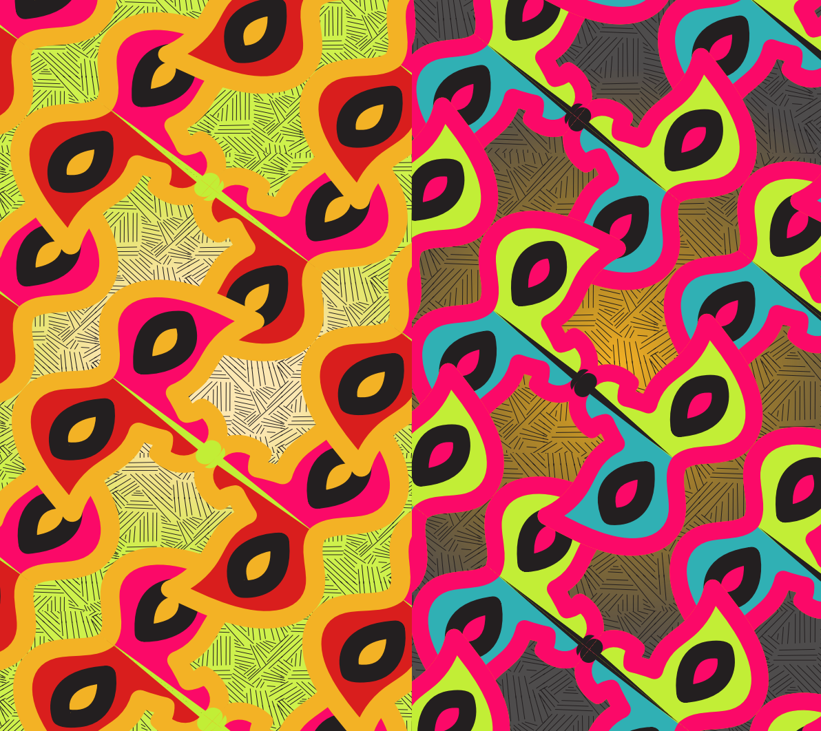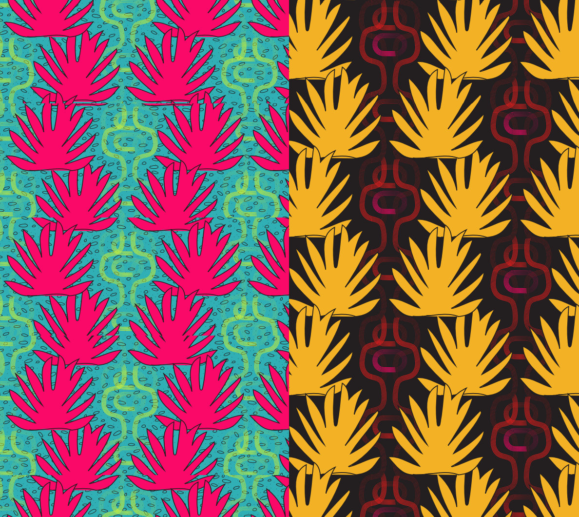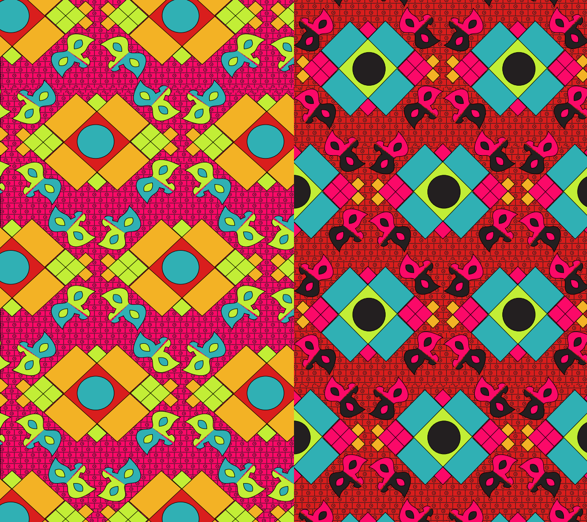 When choosing the colors and icons, all I was thinking was “Go big or go home”. I wanted these prints to be super vibrant, lively, and dynamic, just like the pictures of Carnival I saw. Before this project, I’ve never done anything like this or had much experience with Adobe. So when it was time to transform these icons and colors into prints, I experimented and played with all the features that were available to me. With this time spent experimenting, I think it really helped me achieve a layered look to these prints, and that was important to me because I did not want them to just be one note, I wanted there to be depth and excitement.