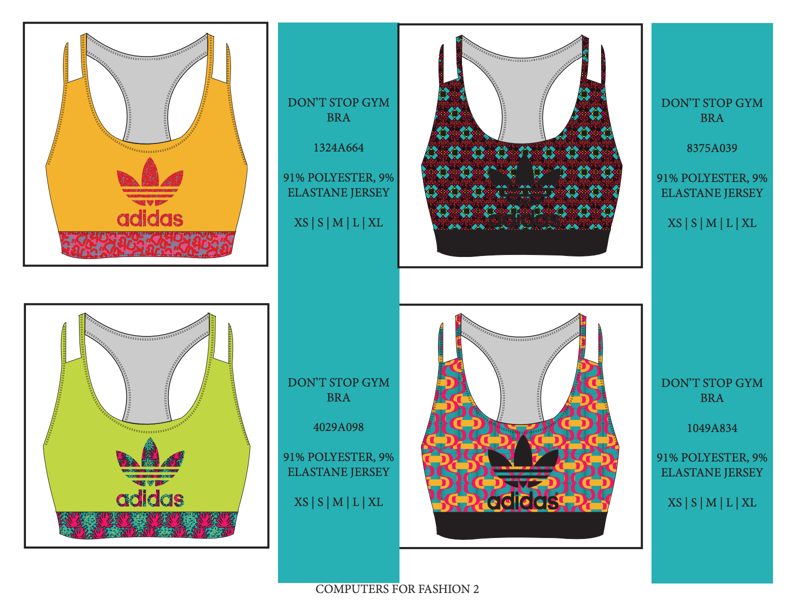 After the textiles were finished, it was time to choose the athletic brand to design the athletic pieces for. I chose Adidas because after keeping up with the brand for a while, I feel like they are not afraid to use loud and funky prints and I could visualize the textiles I created, possibly being something they would’ve sold at some point. I designed a sports bra, tank top, sweatshirt, biker shorts, joggers, and a headband. To create these garments, I used a croquis and the pen tool in Adobe Illustrator. For each of these six garments, I had to create four iterations of it, incorporating the different textiles I made. One of my favorite pieces that I put together was the sports bra because I personally would just love to wear them.