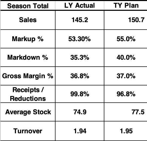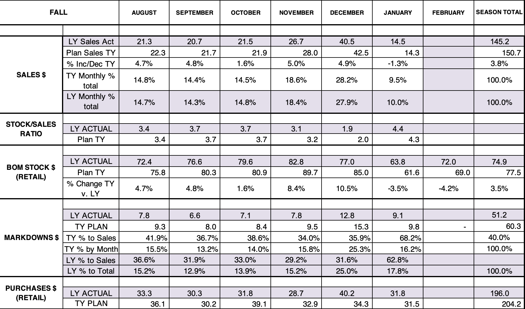 After understanding Macy’s as a company, it was time to get to the nitty gritty and create a six month buying plan. While keeping in mind the previous year’s sales, economic conditions, and market and fashion trends, we had to project sales for the Fall 2022 season. We estimated that Macy’s Inc Women’s Department sales are planned to increase by 3.8% for Fall 2022. One of the reasons for this increase is because of the large amount of expansion the company is implementing. Macy's was planning to expand beyond local malls by opening smaller format stores that Fall. These smaller format stores included two parts: Macy’s Market and Macy’s Backstage. They aimed to broaden their consumer market, by targeting off-price shoppers. Macy's was also expanding the products offered to consumers by allowing third-party retailers to sell on their site and by adding Toys-R-Us and Kylie Cosmetics to their wide range of company partnerships.