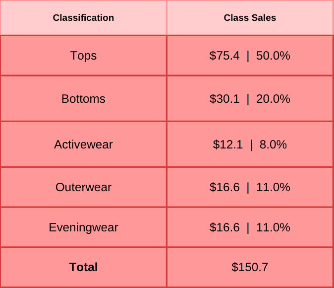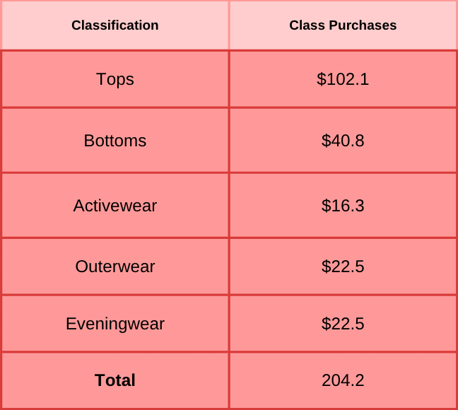 We decided that the Fall 2022 assortment plan for Macy’s women’s department consisted of 50% tops, 20%. bottoms, 8% activewear, 11% outerwear, and 11% evening.