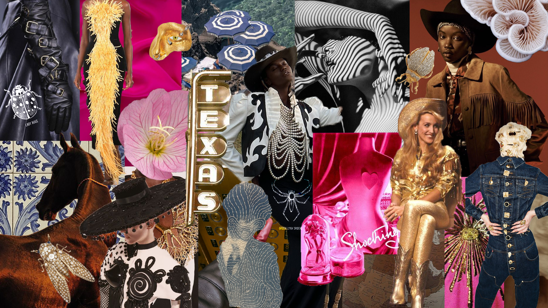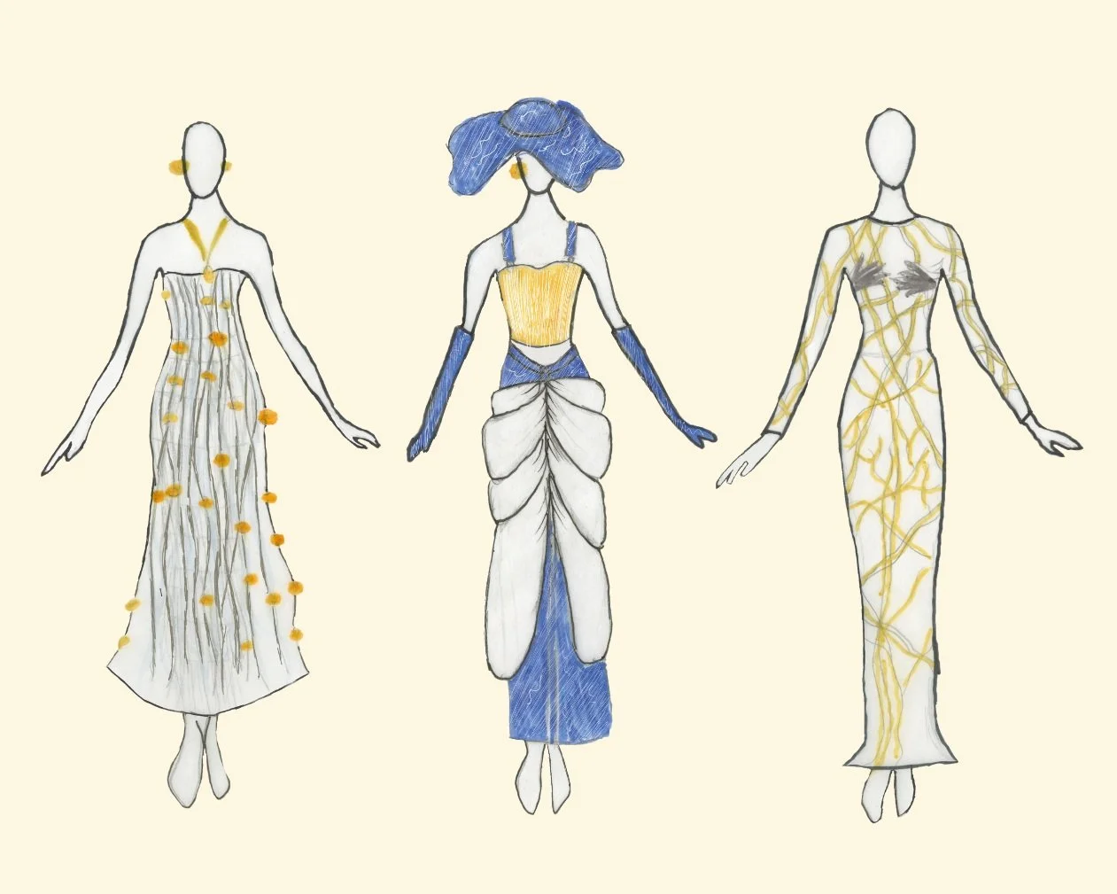 Since it’s Schiaparelli, we had to add a motif that would make the collection a little weird and unusual, so we decided to go with: bugs. We got some pushback from our professors at first because the bugs just seemed odd, but we fought for our bugs. It was the perfect way to strangely portray our nature theme and we found a picture of Elsa Schiaparell wearing a sweater with a giant bug brooch pinned onto it, so it just felt meant to be. The specific bugs we chose are beneficial to the health of cotton plants. Gold insects are used as snap buttons, appliques, and belt buckles to convey the importance of insects in nature. Other nature motifs include: horses and the rare pink Texas bluebonnet. It wouldn’t be Schiaparelli without the use of body casting so gold plated brass will be seen in the collection.