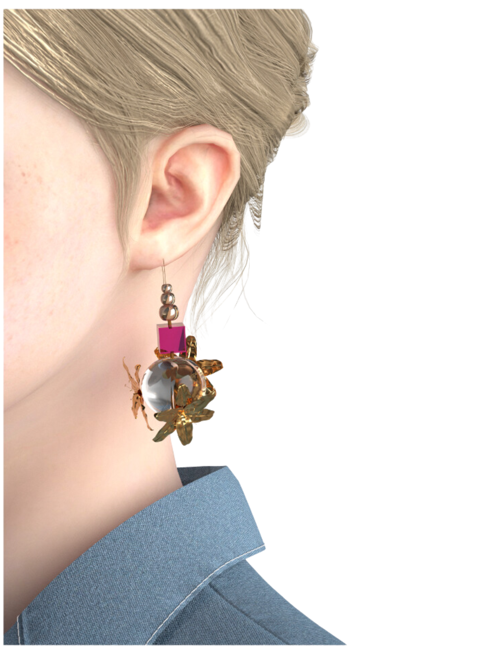 There is no better person to represent Daniel Roseberry’s upbringing and hometown than his sister, Liz Roseberry. Liz Roseberry is a talented jewelry designer who makes fun, unique earrings. Following her style, we wanted to create a pair of earrings with her for the Plano Collection. These earrings have gold and shocking pink beads and the flowers are inspired by the cotton flower.